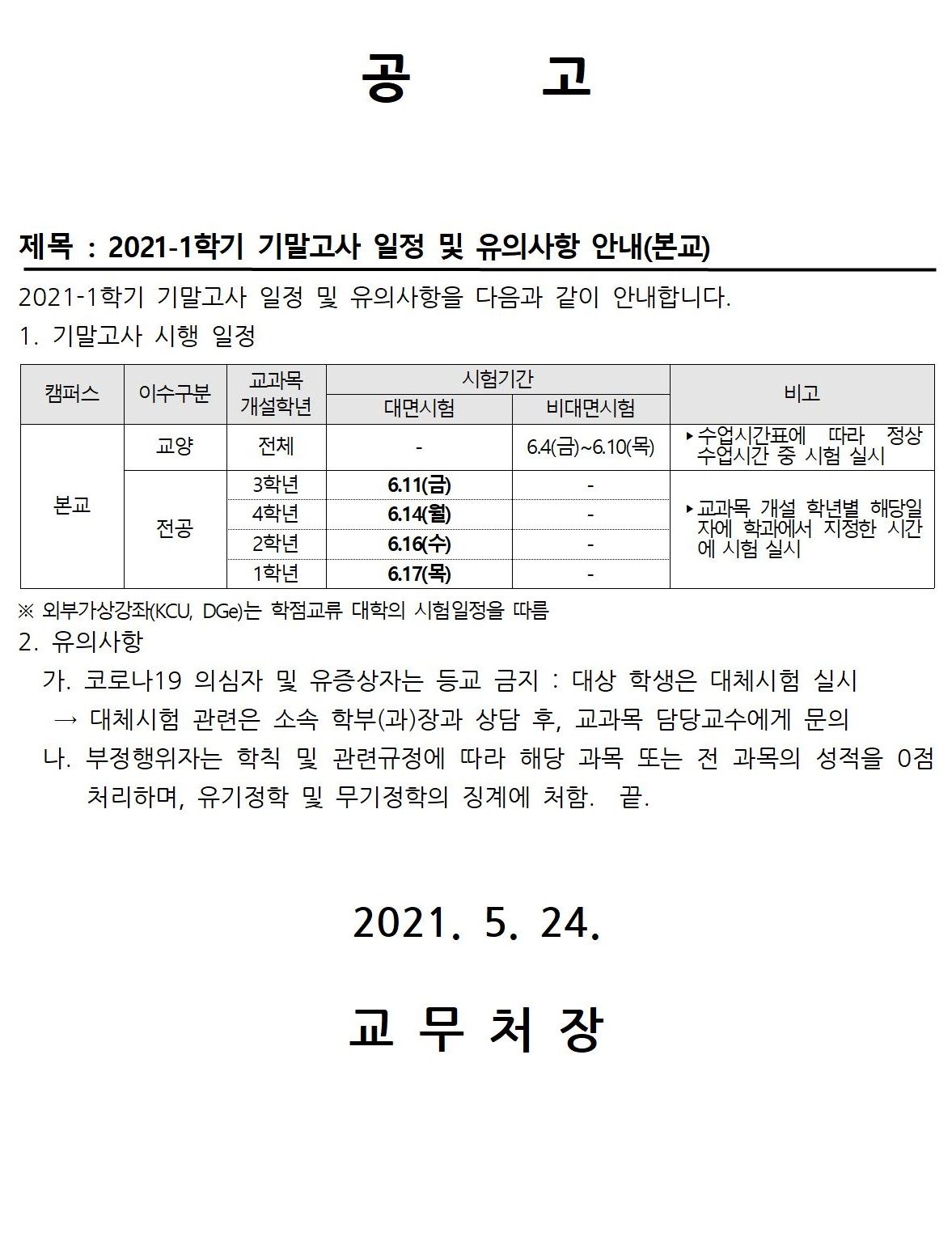 2021-1학기 기말고사 일정 및 유의사항 안내(본교)