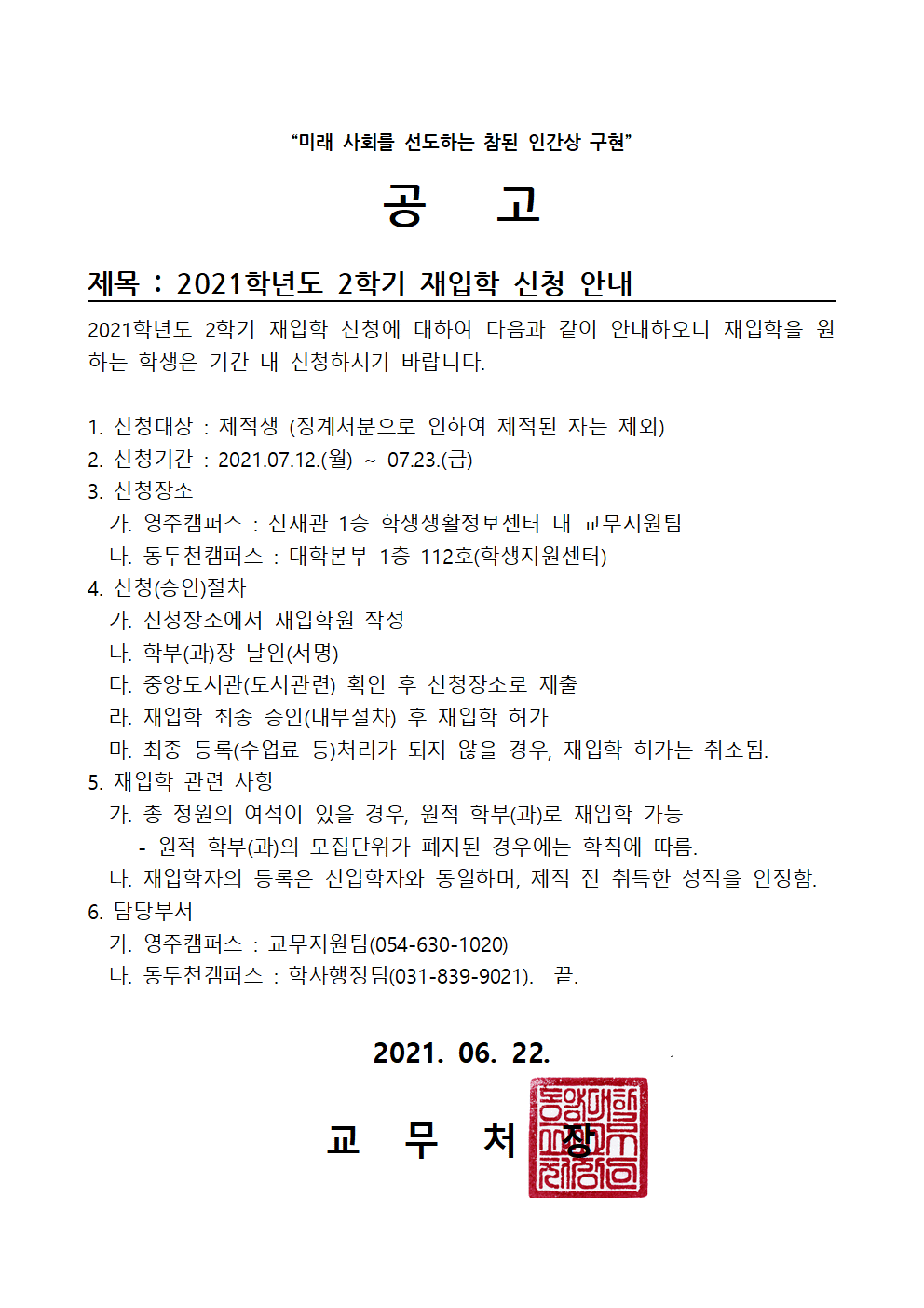 > 학과공지 > 2021학년도 2학기 재입학 신청 안내