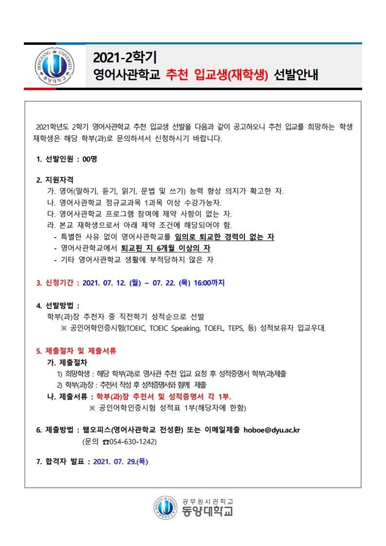 HOME > 학과공지 > 21-2학기 학과장 추천 입교생 선발 안내(영어사관학교) 커뮤니티학과공지 자료실 학과소식 갤러리 학생활동 페이스북 학과공지 21-2학기 학과장 추천 입교생 선발 안내(영어사관학교) 목록보기