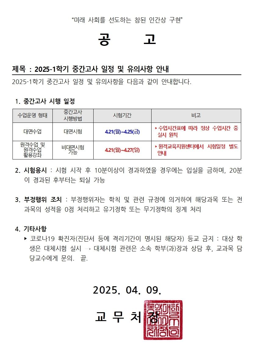 HOME > 학과공지 > 2025-1학기 중간고사 일정 및 유의사항 안내 커뮤니티학과공지 자료실 학과소식 갤러리 학생활동 페이스북 학과공지 2025-1학기 중간고사 일정 및 유의사항 안내 목록보기