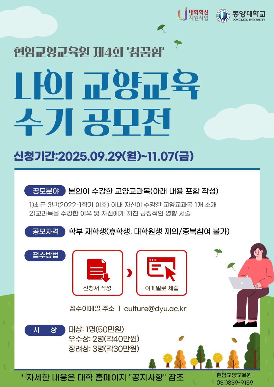 HOME > 학과공지 > 나의 교양교육 수기 공모전 신청기간 연장 안내 커뮤니티학과공지 자료실 학과소식 갤러리 학생활동 페이스북 학과공지 나의 교양교육 수기 공모전 신청기간 연장 안내 현암교양교육원에서는 “나의 교양교육 수기 공모전” 신청기간을 다음과 같이 연장합니다. 신청기간:2025.09.29(월)~11.07(금) 목록보기